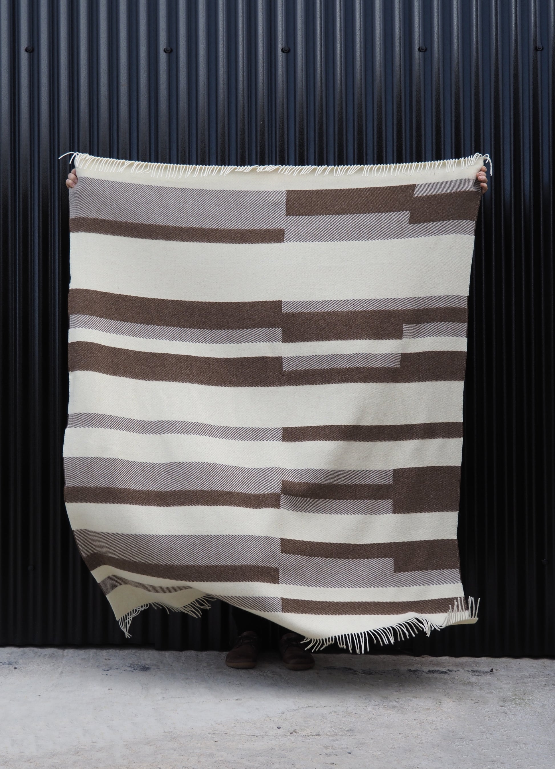 These blankets are extra special though, because they are part of a big community weave project. The mill used one warp for more than 20 different farms and brands together on one weaving run. It allowed the mill to use up their leftover British Wool yarns and we were able to access big scale weaving at a more accessible price. Although the warp is shared, each designer or farm takes their own section along the run to use their own yarns and pattern on the weft.